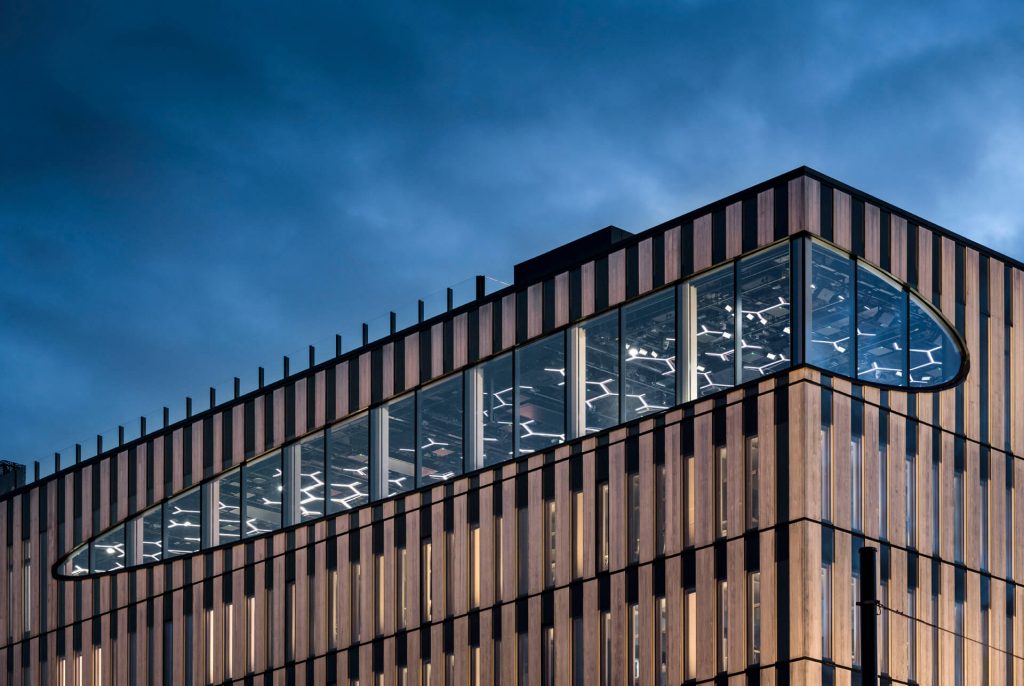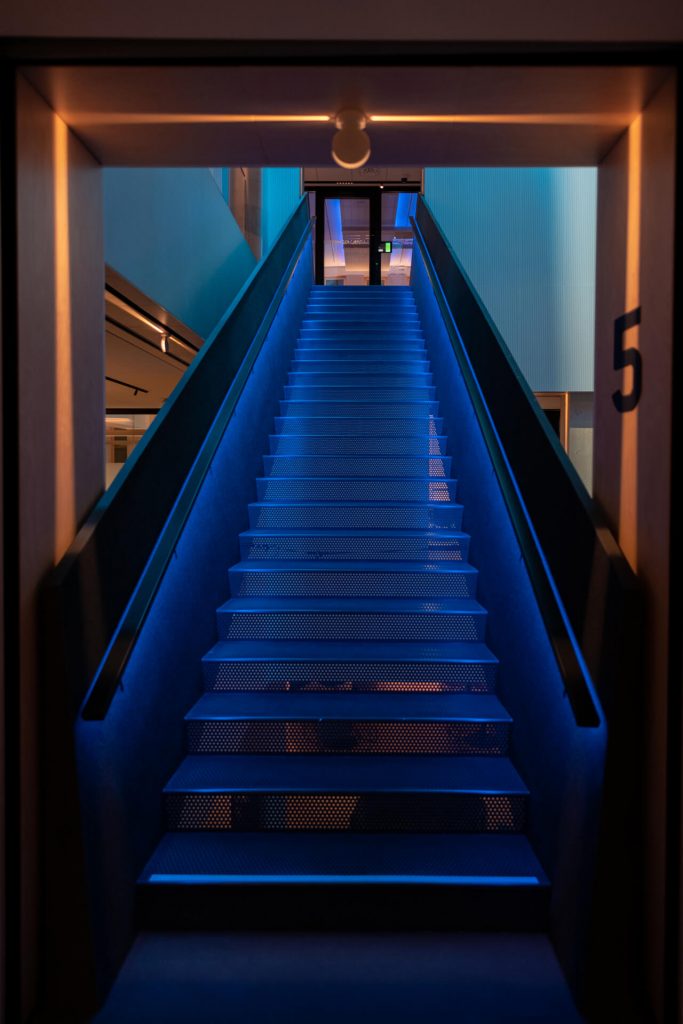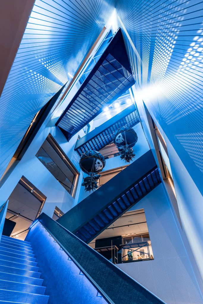 The Hexagon lighting on the top floor illustrates the company’s core ideology: cells. The moving and living light of the Hexagon symbolizes the birth, merging, and separation of cells, their beginning and end. It is guided by daylight, as well as wind strength and direction. The Hexagon lighting can also be integrated and programmed as part of the AV system used for various events. The basic lighting is discreet accent lighting.