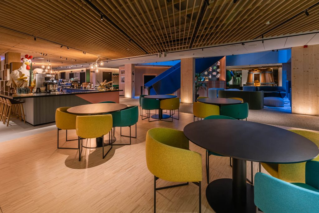 The atrium opens from the cafe floor, with a staircase leading to the office floors and the top restaurant and auditorium floor. The fictional appearance of the atrium, created by lights, is like the heart and soul of Supercell. Abstractly transforming hues and slow movement give space to imagination. Imperceptibly, the light transforms according to seasons and times of day, always appearing different.