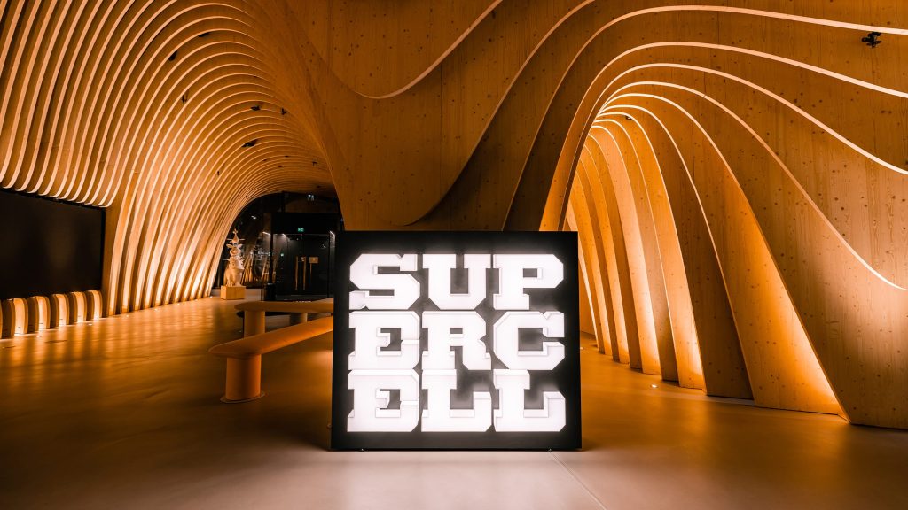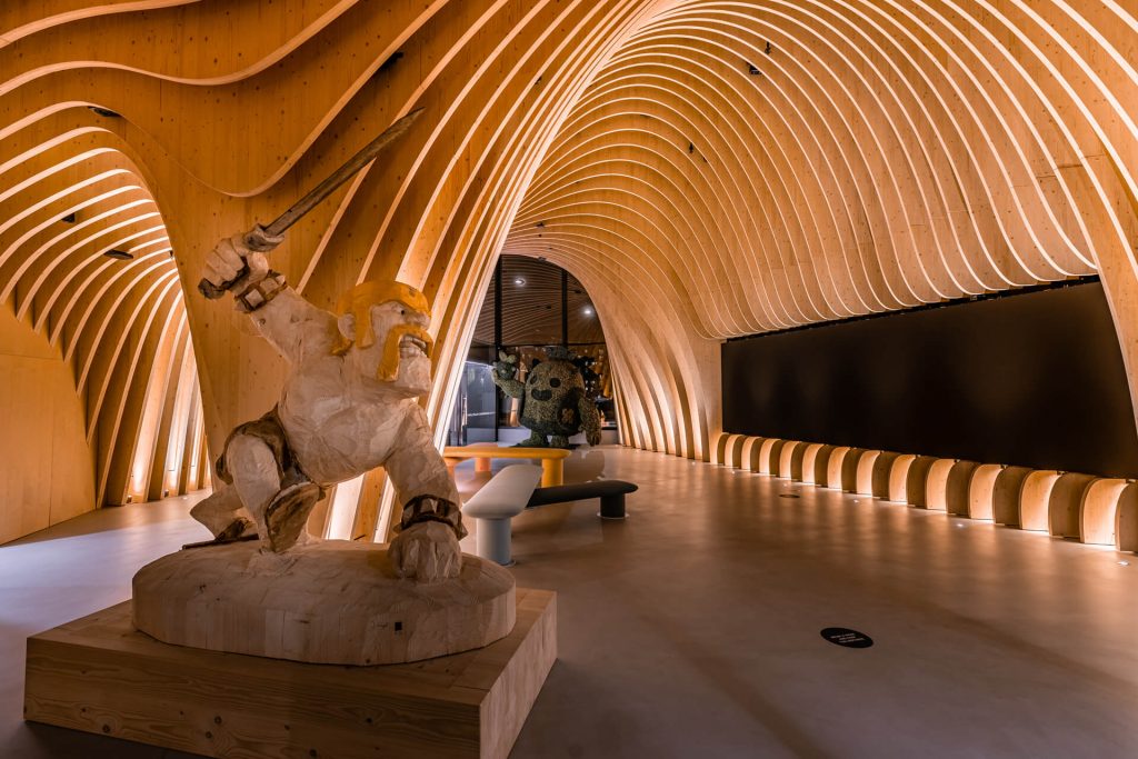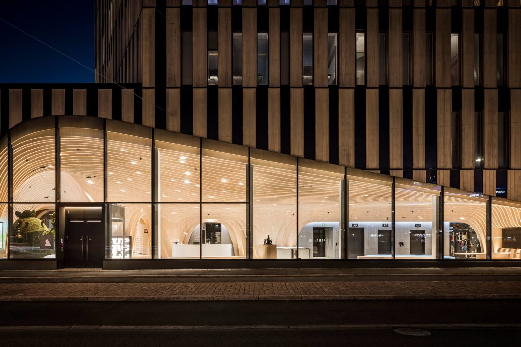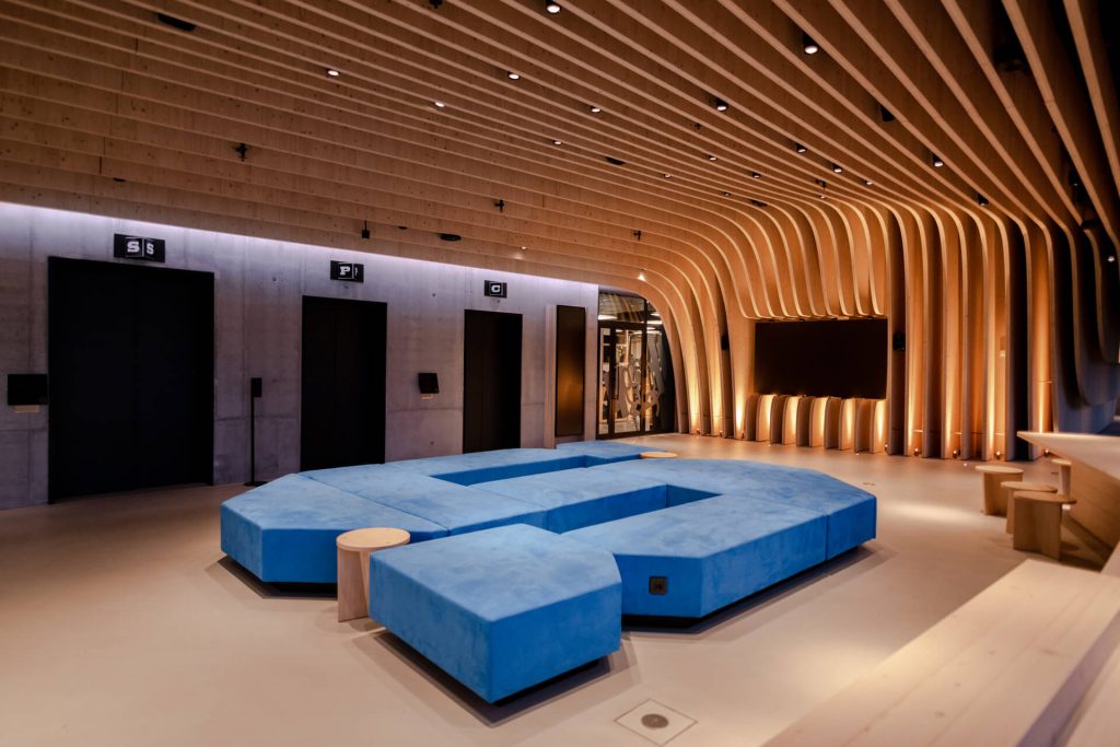 The lobby showcases unique wooden architecture, dramatically highlighted by light. During the day, the general lighting is brighter; as darkness falls, the light dims, and the lobby also becomes part of the streetscape. Game characters highlighted by light communicate the company’s identity. The warmth of wood and the coolness of concrete create a tasteful combination.