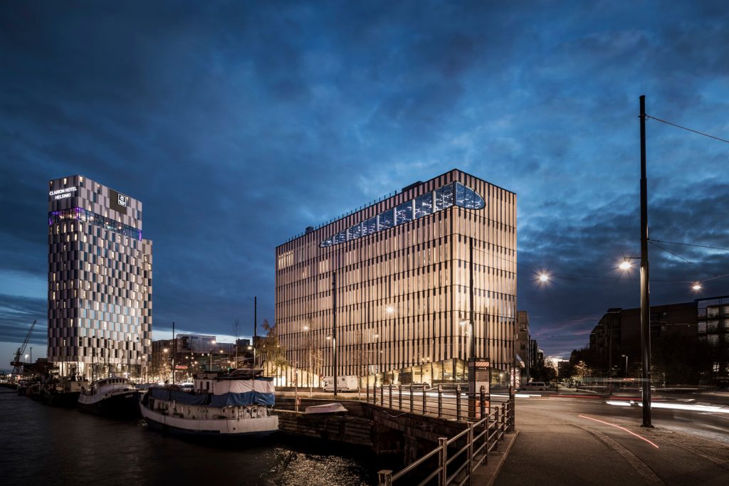 In office spaces, light indirectly highlights surfaces. The lighting is subtle and restrained; quiet. In the morning, it is cooler and more intense. As evening falls, the warmly lit pilasters on the exterior walls create a campfire-like atmosphere, contrasting with the Helsinki cityscape visible through the adjacent windows.